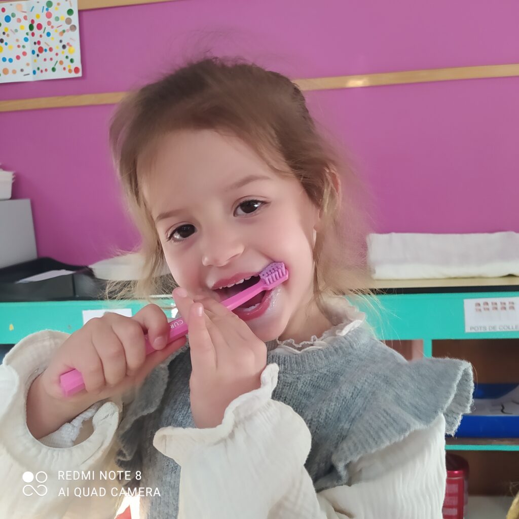 – » Après chaque repas je frotte mes dents doucement à l’aide d’une brosse à dent et un peu de dentifrice, de la gencive vers les dents dans un mouvement circulaire, puis sur les dents sans oublier la langue ! »