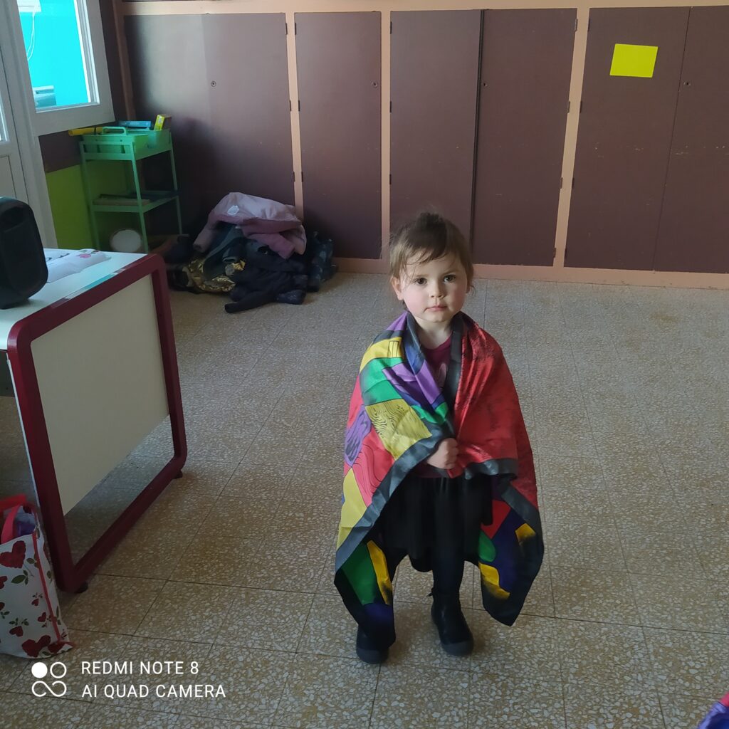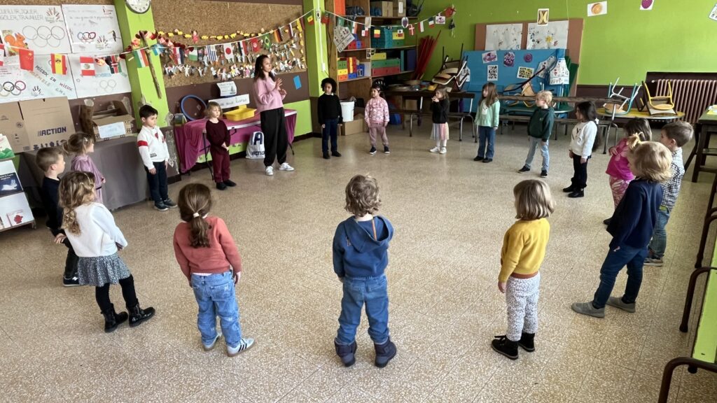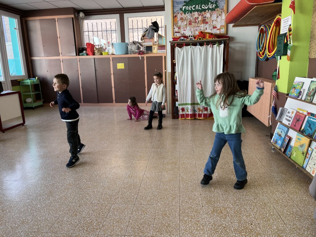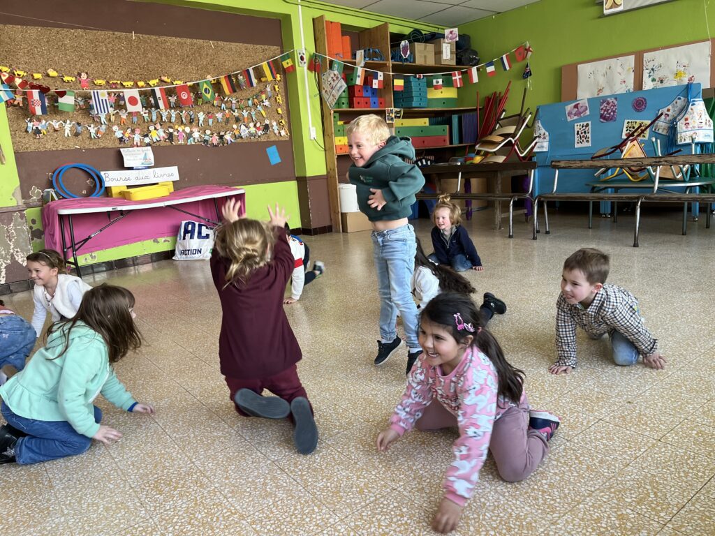 Sabrina nous a appris une petite danse. On se décalait vers la droite, puis vers la gauche. Ensuite on faisait semblant de lever un poids vers le haut, vers le bas. Après on faisait l’étoile, on écartait les bras et les jambes. Et à la fin on s’est mis accroupi.