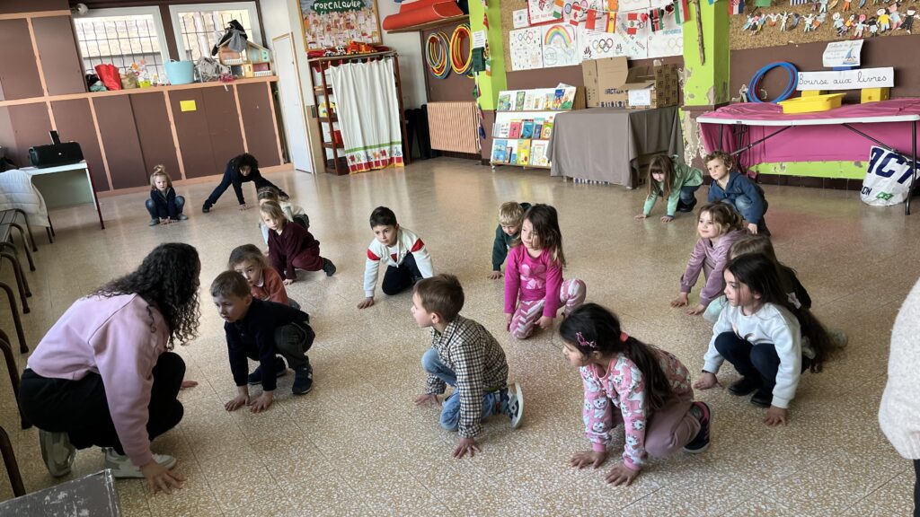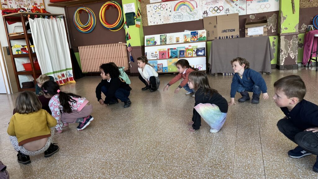 On a joué au jeu des animaux : on écoutait attentivement la musique, on entendait les bruits des animaux. Si on entendait le lion rugir, on se mettait à quatre pattes et on rugissait. Si on entendait l’oiseau, l’aigle, on se mettait debout et volait avec nos bras : on les écartait et on les levait, on les baissait. On a sauté comme une grenouille en nous accroupissant, on a rampé comme le serpent en nous allongeant par terre et en rampant.