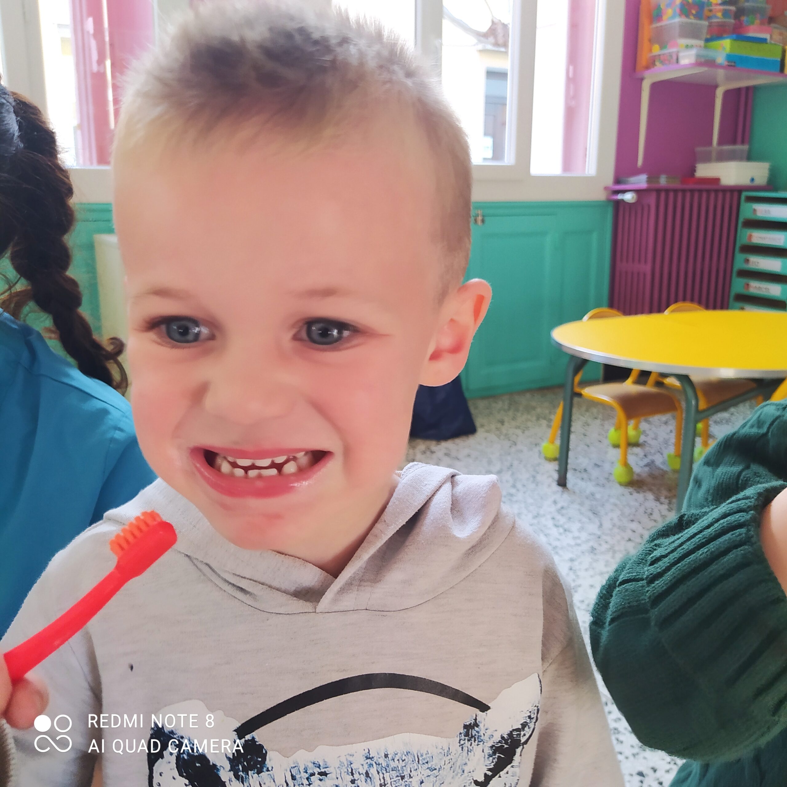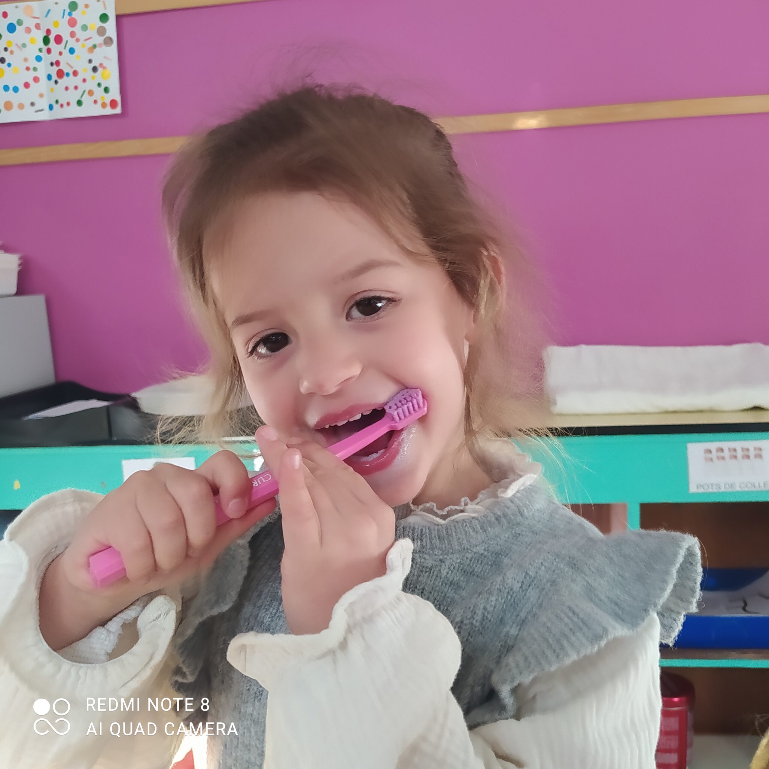 – » Après chaque repas je frotte mes dents doucement à l’aide d’une brosse à dent et un peu de dentifrice, de la gencive vers les dents dans un mouvement circulaire, puis sur les dents sans oublier la langue ! »