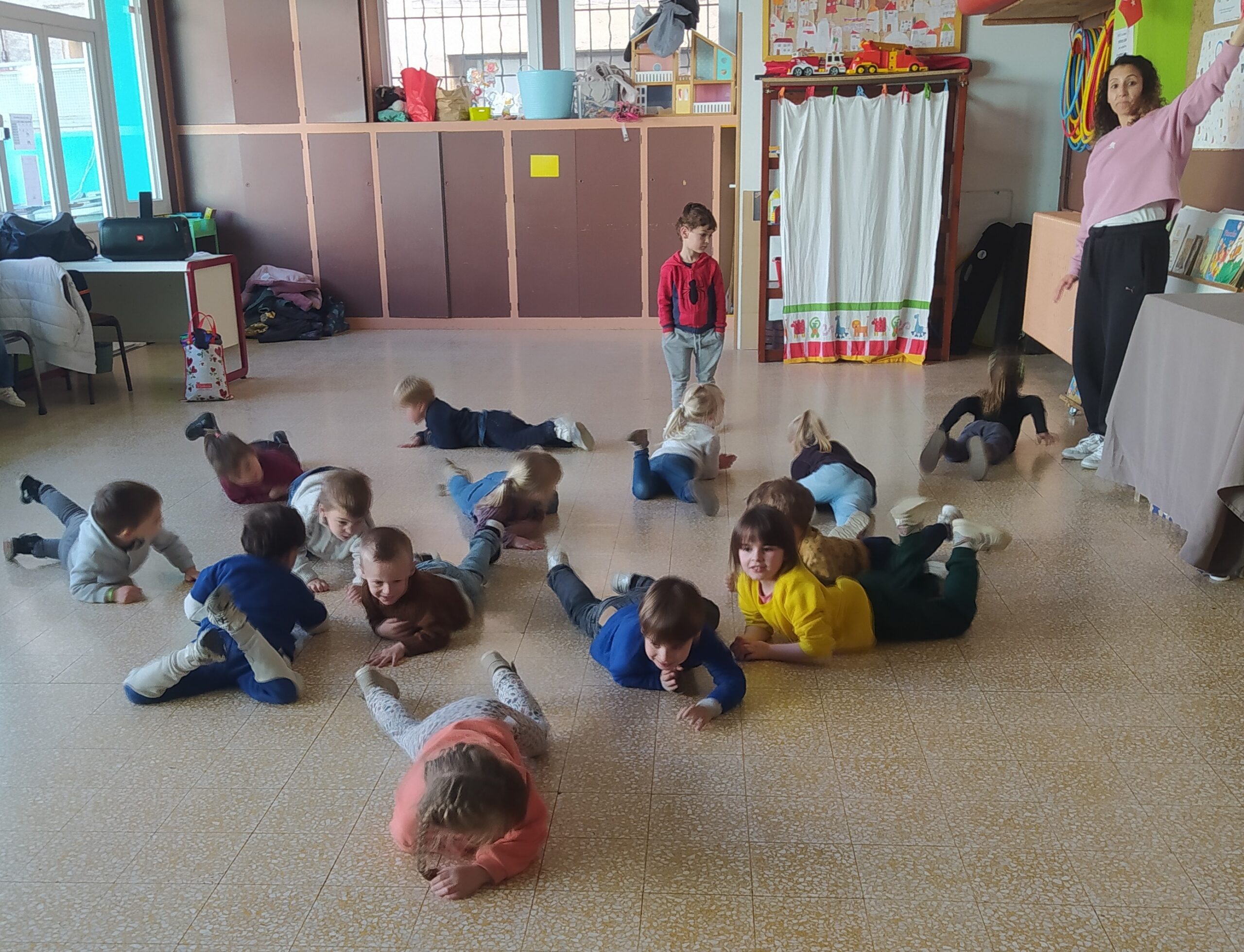On a joué au jeu des animaux : on écoutait attentivement la musique, on entendait les bruits des animaux. Si on entendait le lion rugir, on se mettait à quatre pattes et on rugissait. Si on entendait l’oiseau, l’aigle, on se mettait debout et volait avec nos bras : on les écartait et on les levait, on les baissait. On a sauté comme une grenouille en nous accroupissant, on a rampé comme le serpent en nous allongeant par terre et en rampant.