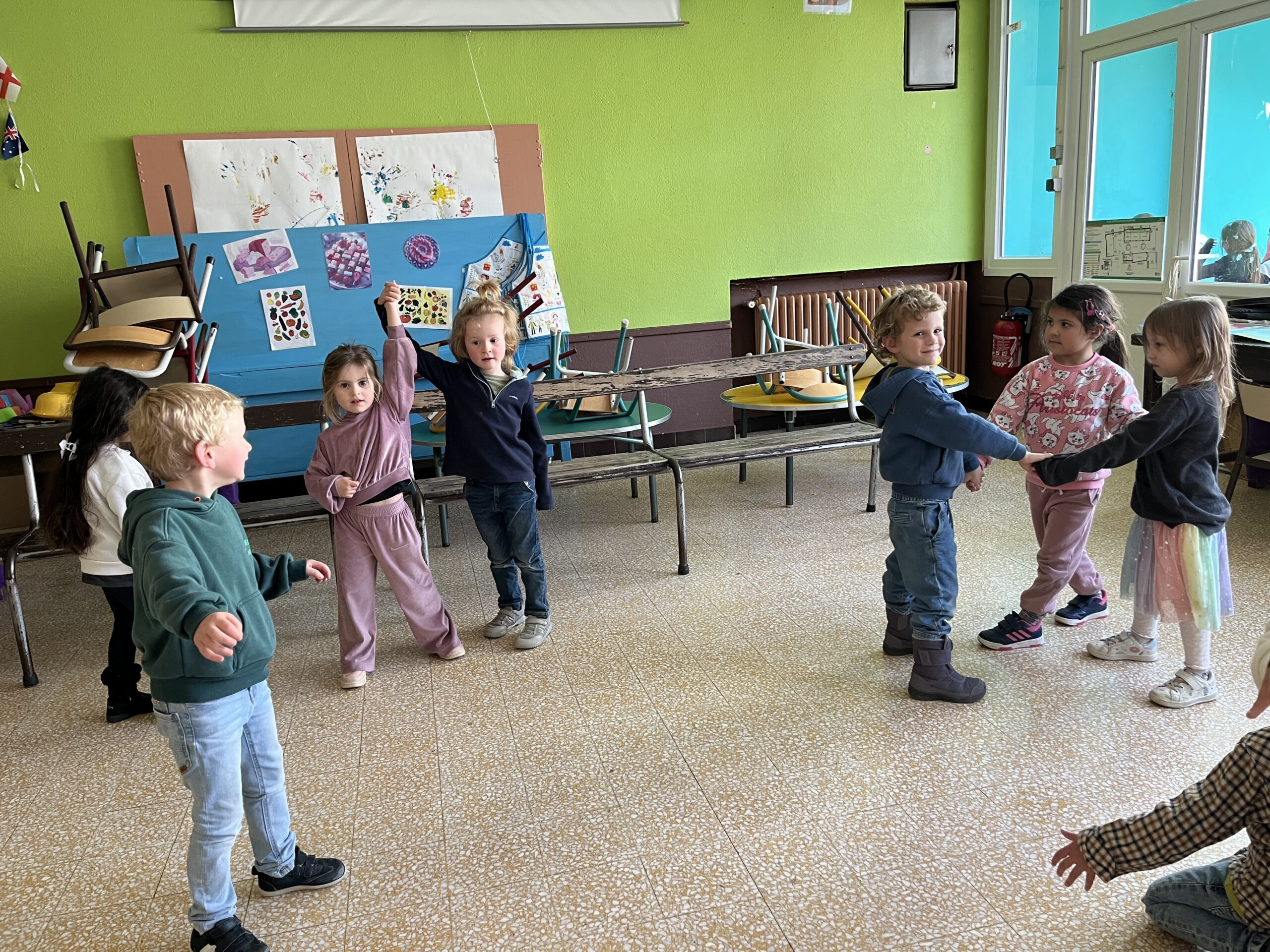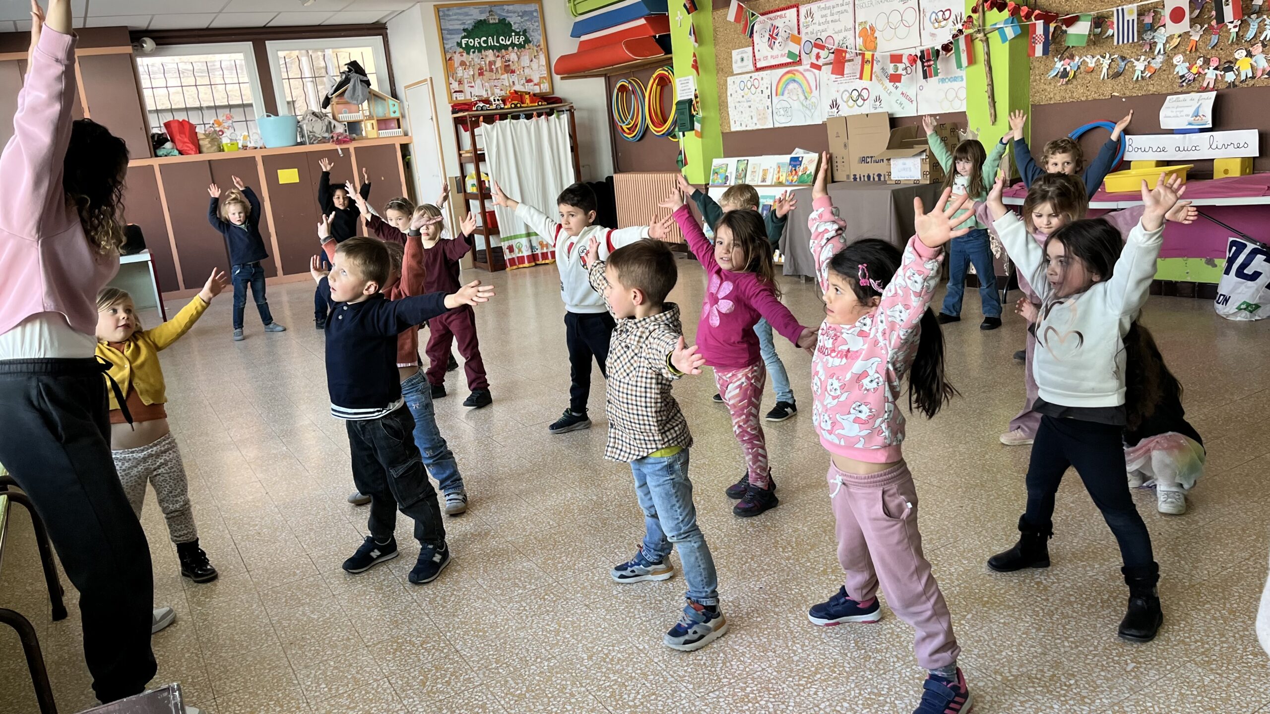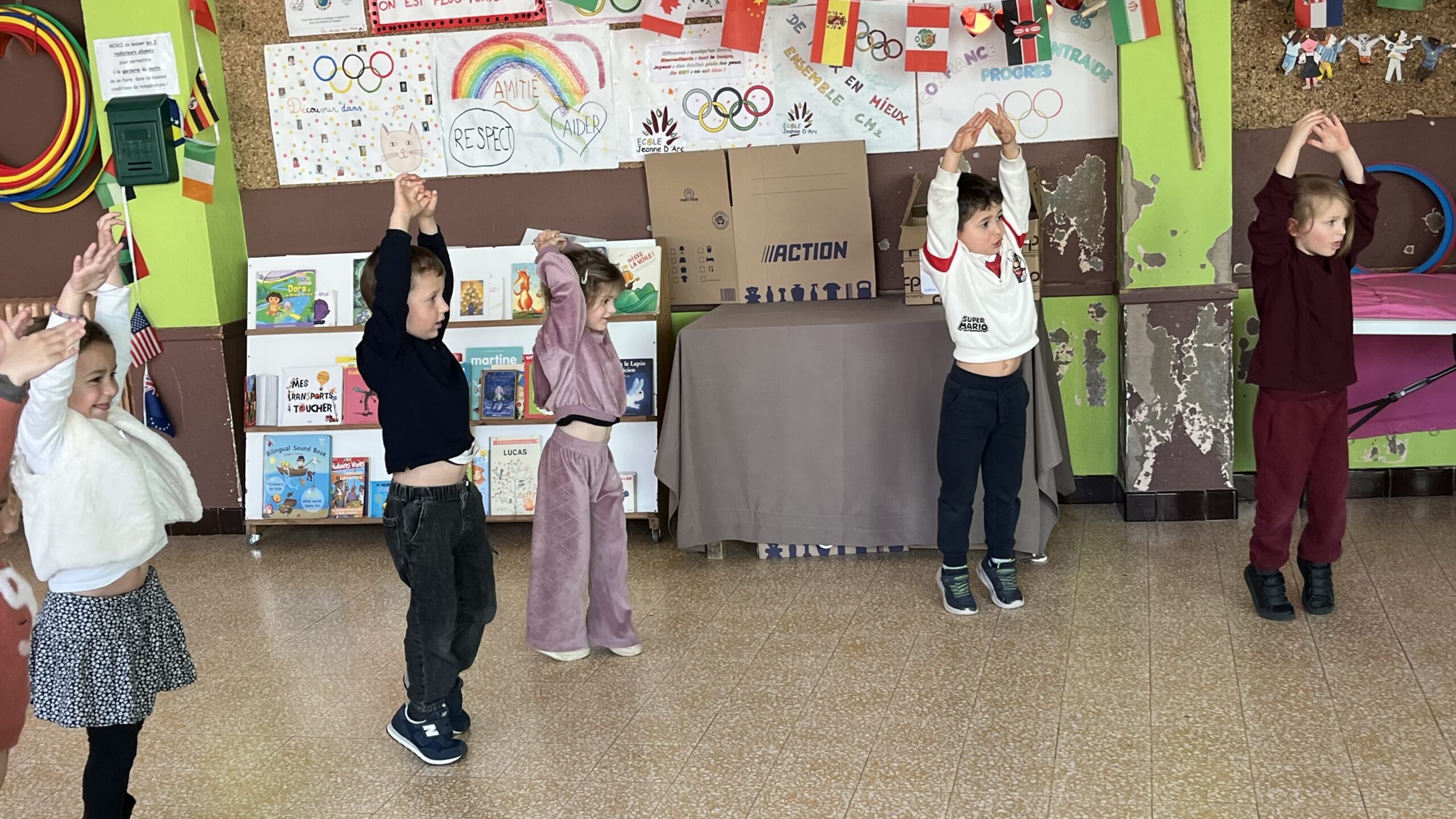 Sabrina nous a appris une petite danse. On se décalait vers la droite, puis vers la gauche. Ensuite on faisait semblant de lever un poids vers le haut, vers le bas. Après on faisait l’étoile, on écartait les bras et les jambes. Et à la fin on s’est mis accroupi.