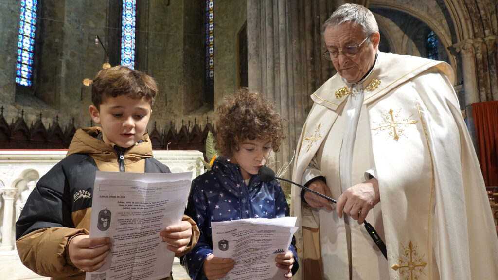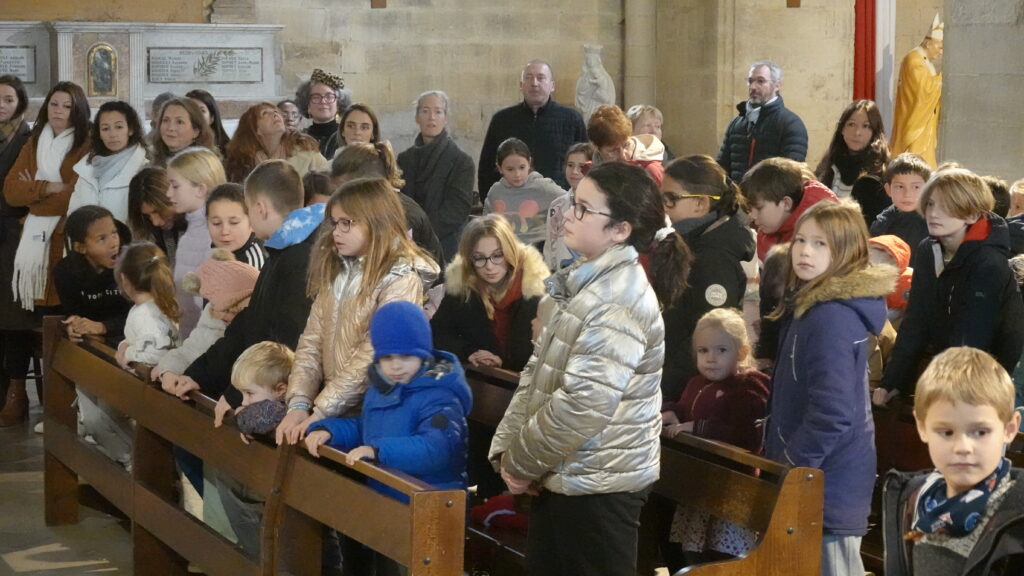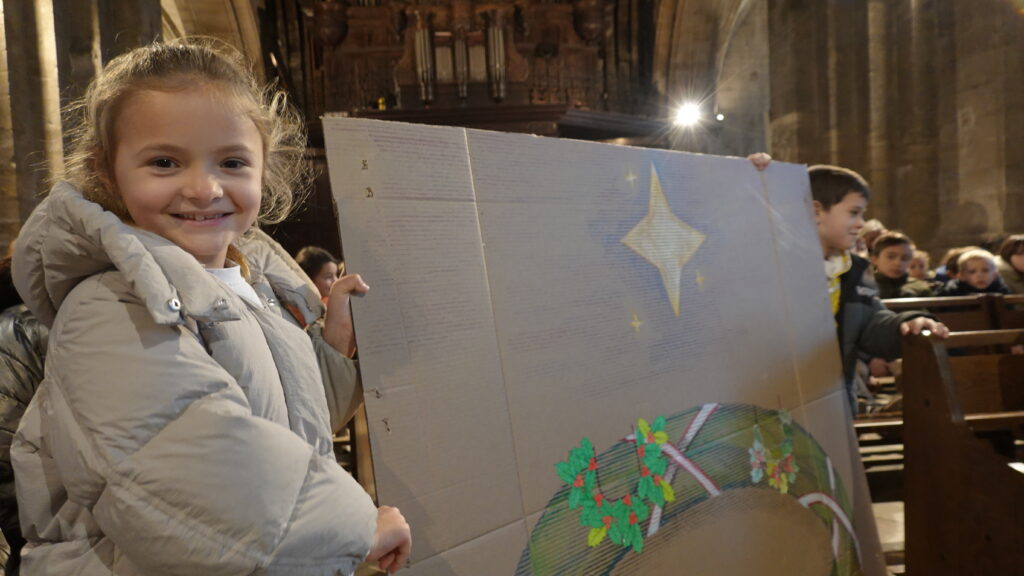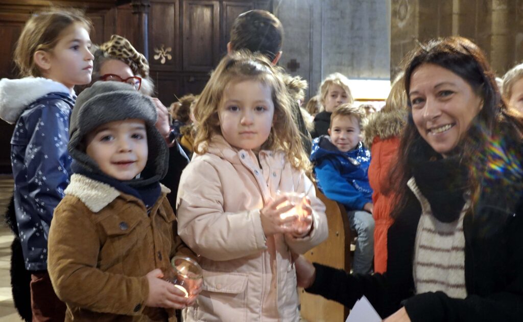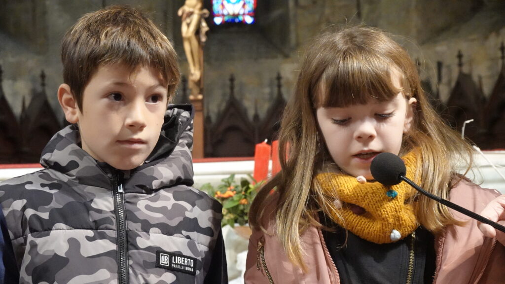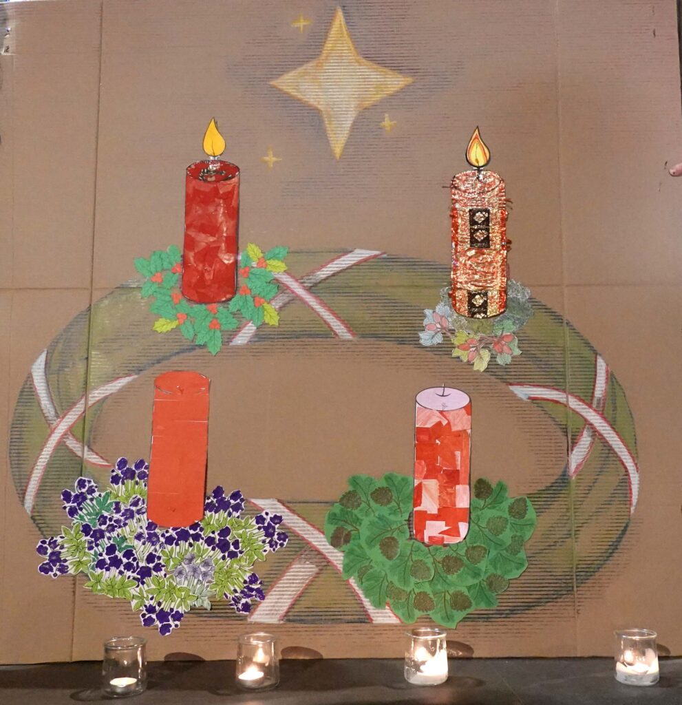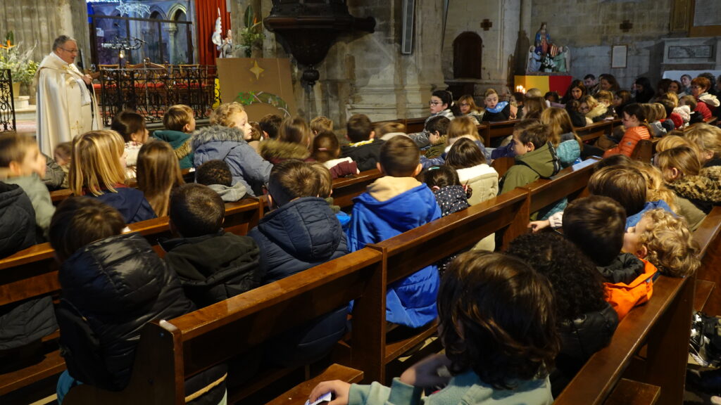 Après le chant d’entrée « Jubilez, criez de joie », des représentants des classes de PS, MS, GS et CP sont montés en procession. Ils amenaient le panneau de la couronne de l’Avent qu’ils avaient réalisé en classe.