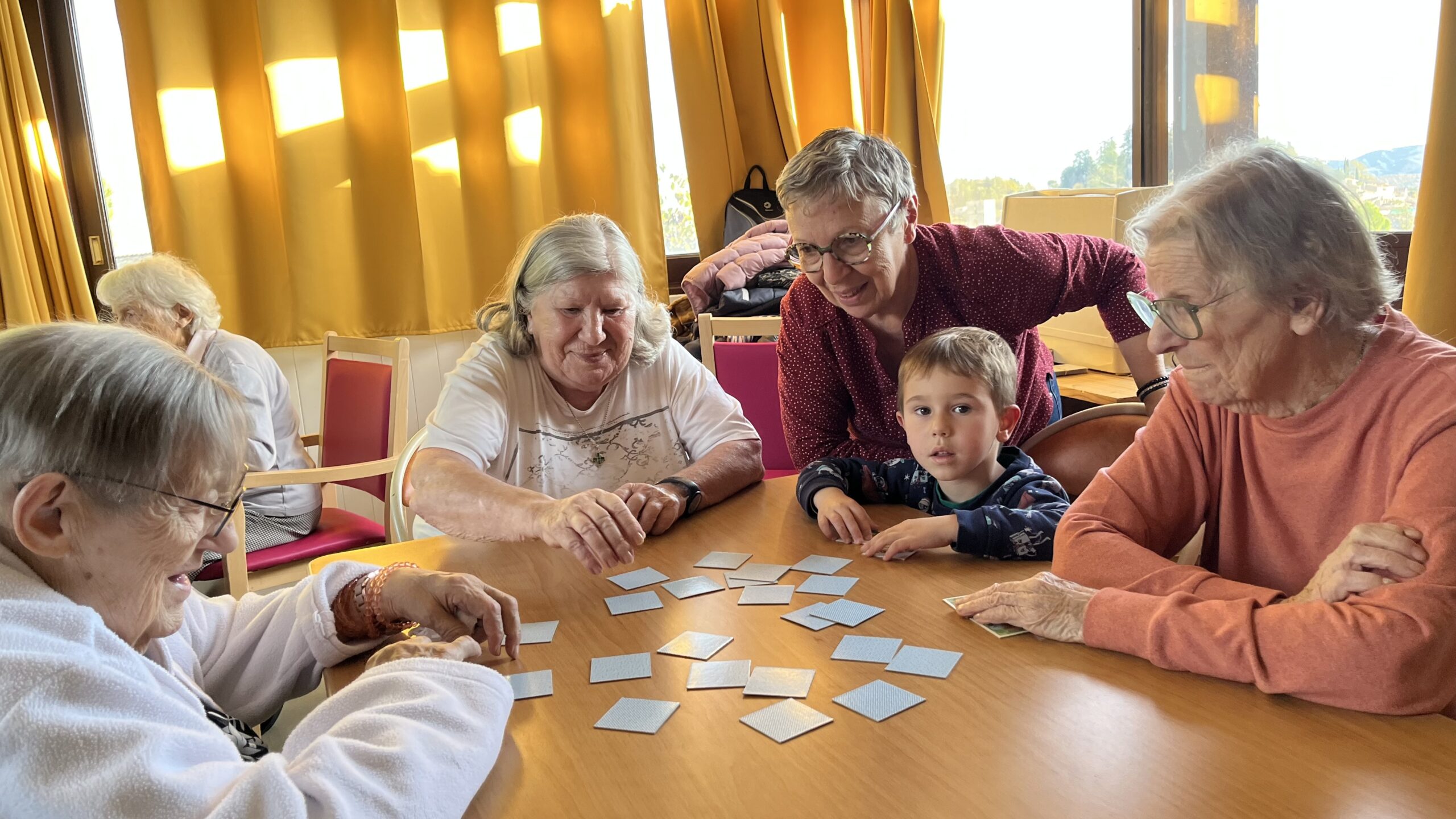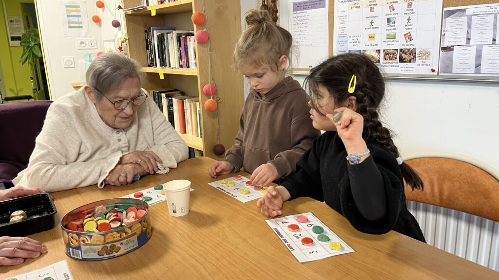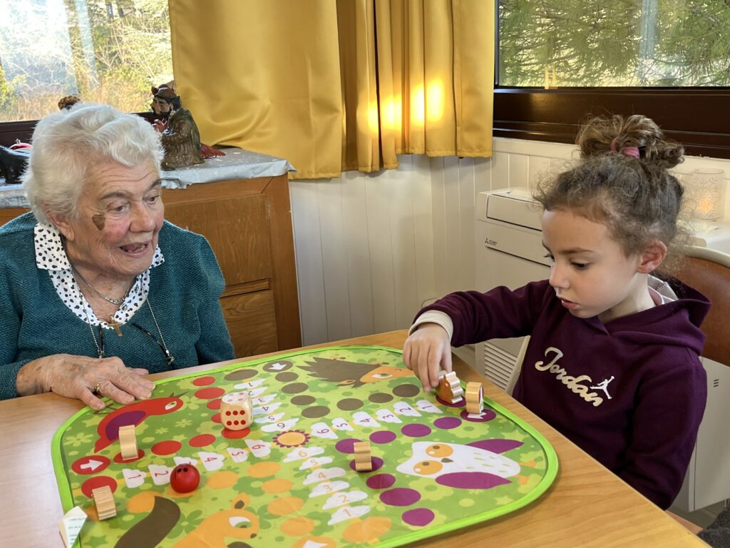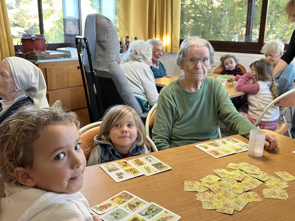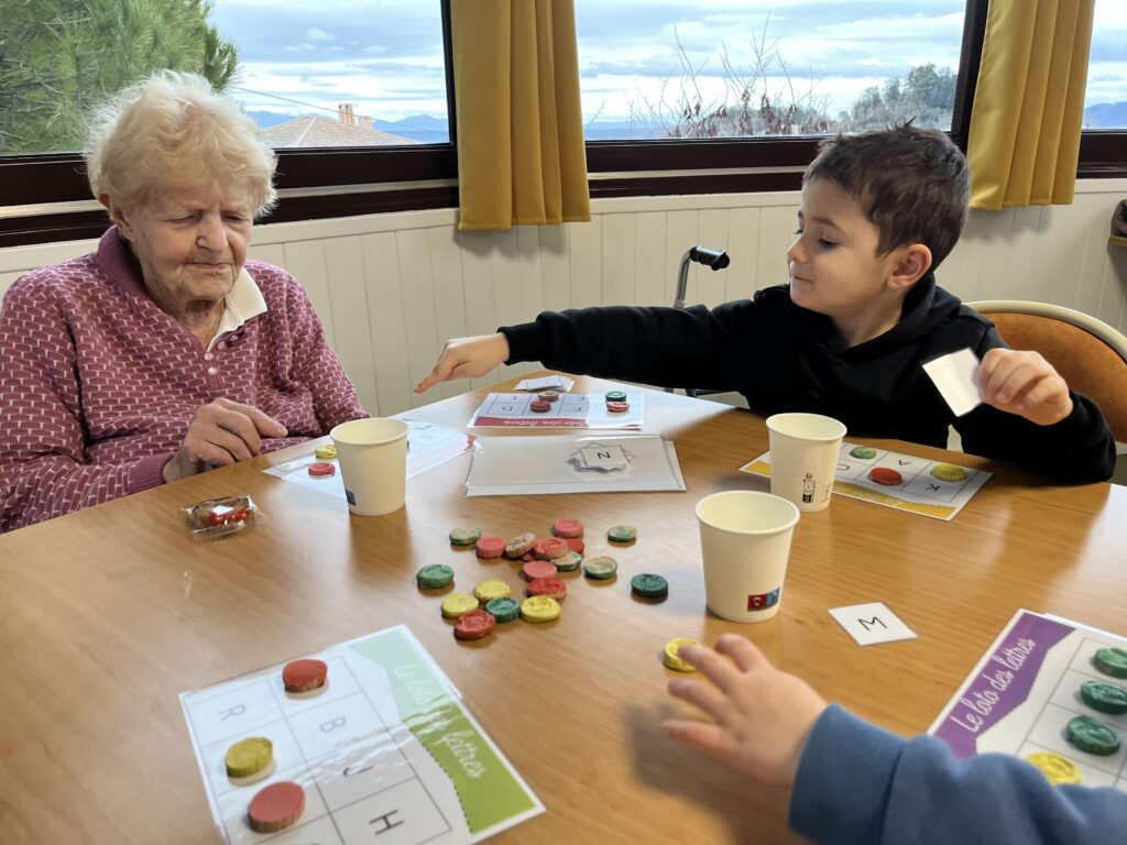 Une fois par mois un groupe de 6 élèves de la classe de Moyenne Section se rend à l’EHPAD Lou Seren pour rencontrer les résidents. Ensemble ils jouent à divers jeux de société.
