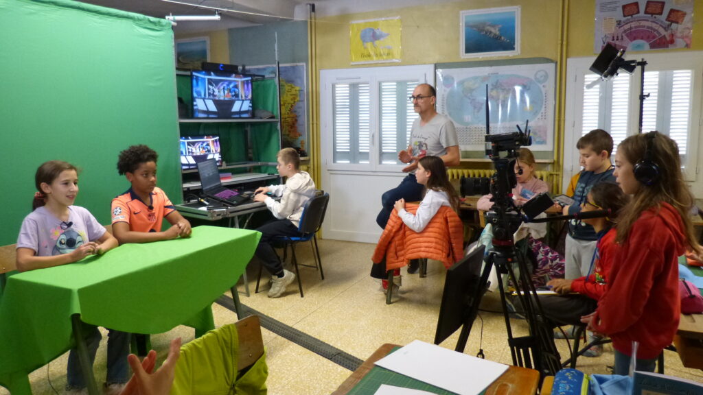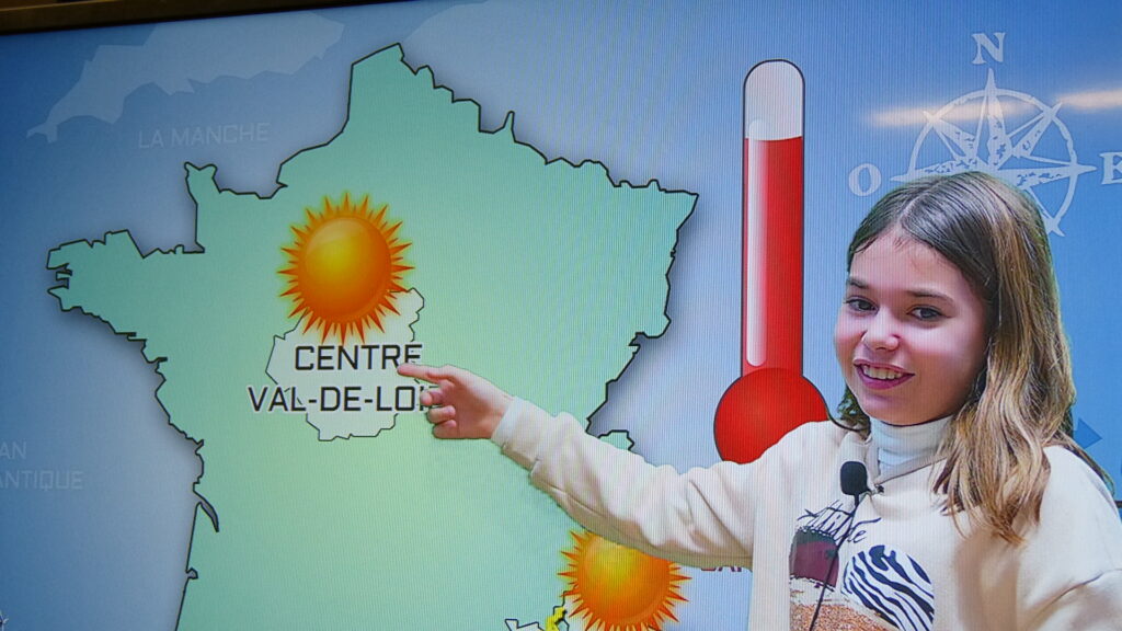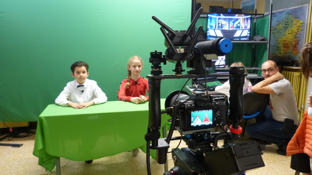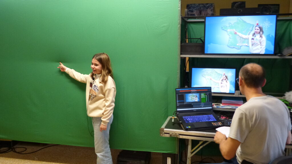 En classe, nous avons écrit le texte des présentateurs et nous avons enregistré le début du journal télévisé, devant le tissu vert pour l’incruster sur un décor.