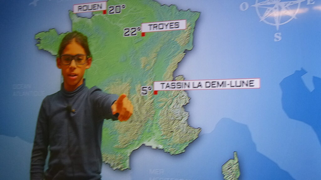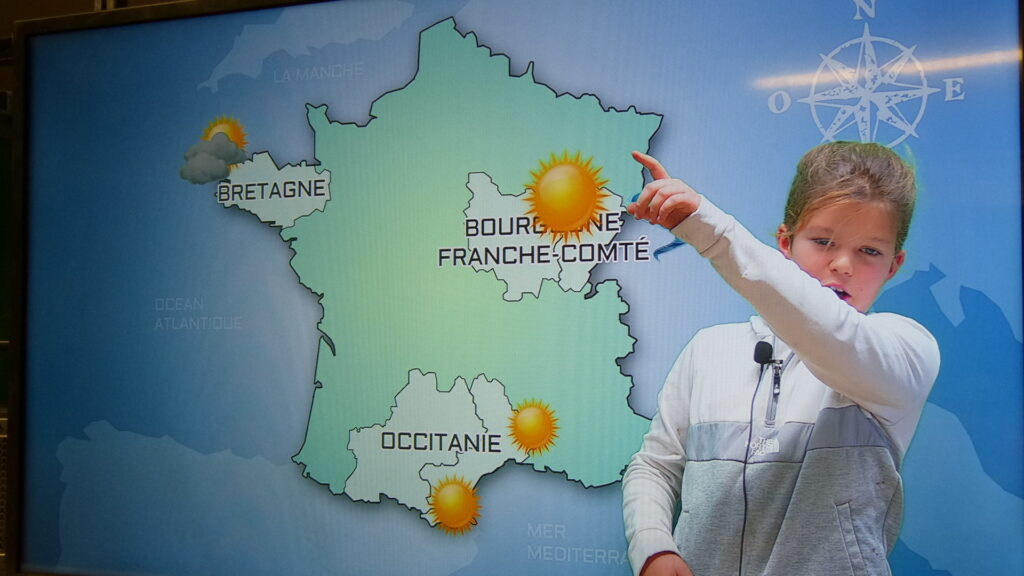 Pour terminer, nous avons appris à présenter la météo. Nous devions montrer sur le tissu vert en regardant le moniteur de contrôle et notre image était incrustée sur la carte. C’était difficile car l’image sur le moniteur était inversée par rapport au tissu vert et c’était très drôle.