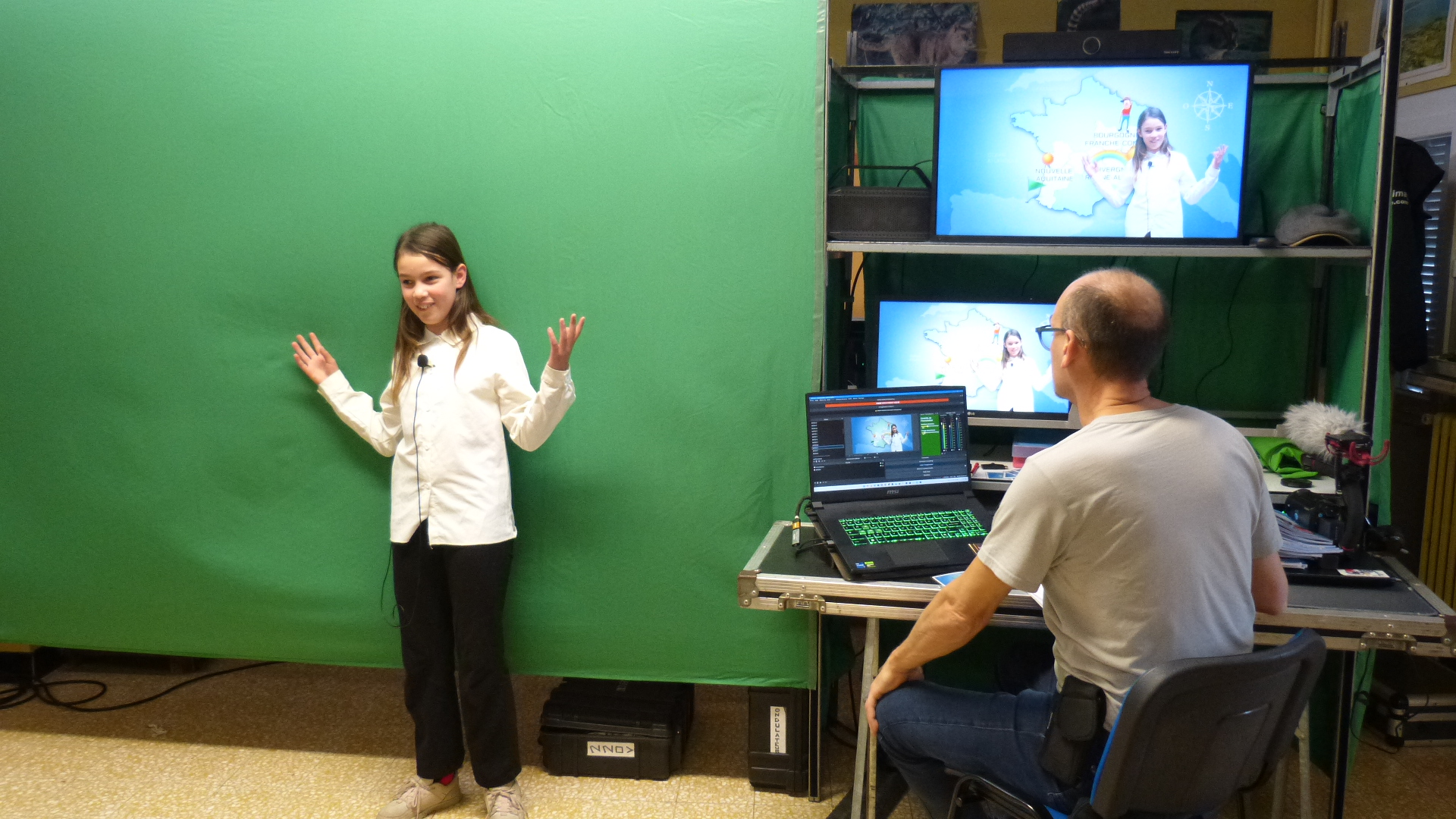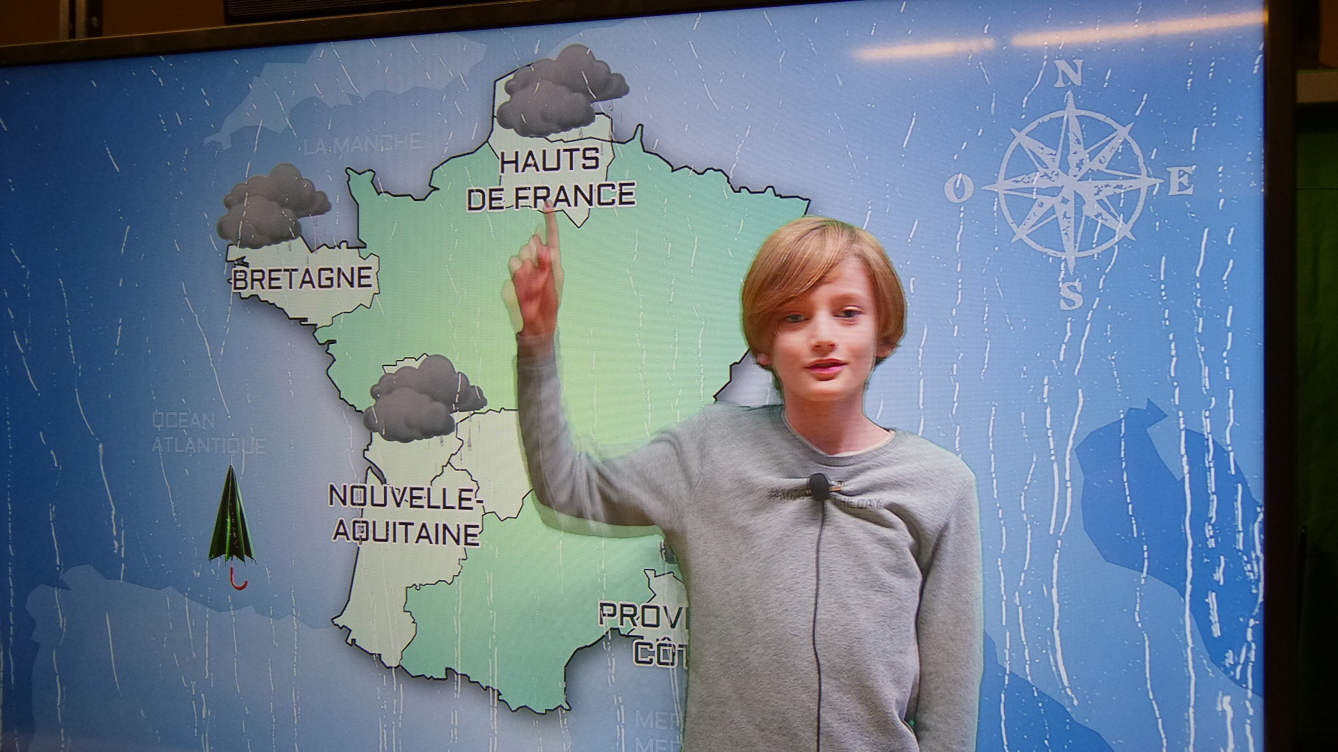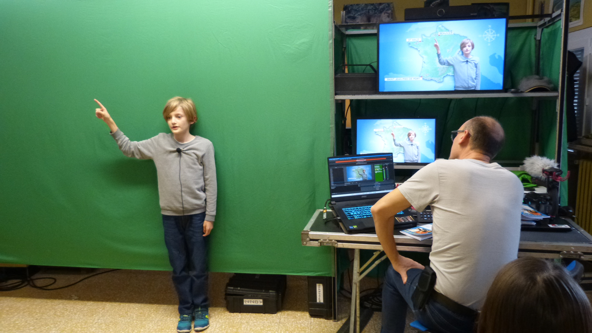 En classe, nous avons écrit le texte des présentateurs et nous avons enregistré le début du journal télévisé, devant le tissu vert pour l’incruster sur un décor.