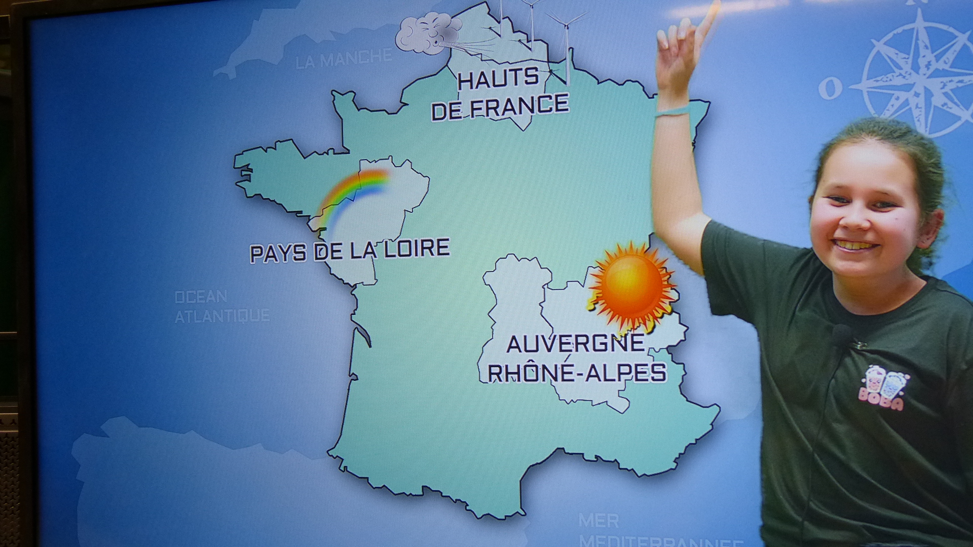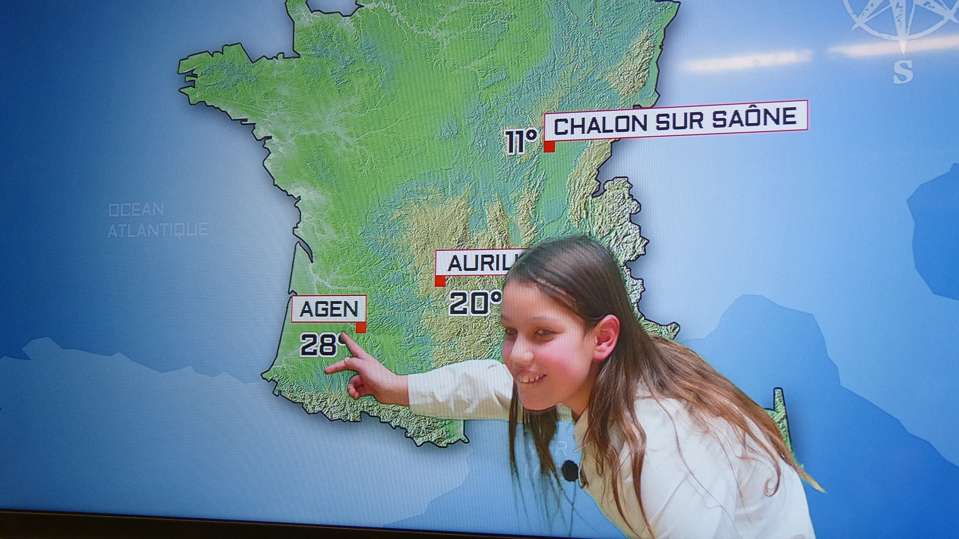 Pour terminer, nous avons appris à présenter la météo. Nous devions montrer sur le tissu vert en regardant le moniteur de contrôle et notre image était incrustée sur la carte. C’était difficile car l’image sur le moniteur était inversée par rapport au tissu vert et c’était très drôle.